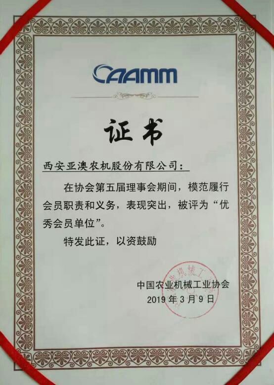 大会宣读了中国机械工业联合会《关于中国农业机械工业协会理事会换届的批复》。审议通过了陈志会长代表协会第五届理事会作的《中国农机工业协会第五届理事会工作报告》和侯庆忠执行副会长作的《中国农机工业协会第五届理事会财务收支情况报告》,审议通过了《中国农业机械工业协会章程》,选举产生了中国农业机械工业协会第六届理事会和第一届监事会。 为表彰协会五届理事会履职以来,为推进农机工业技术进步和健康发展做出积极贡献的优秀集体和个人,会议还授予侯庆忠等10人为“优秀协会工作者”,授予企业管理委员会等5个分支机构为“先进分支机构”,授予西安pa旗舰厅官网股份有限公司等33家单位为“优秀会员单位”。 pa旗舰厅官网总经理史森强应邀参会并参加相关活动。荣获“优秀会员单位”是协会对亚澳多年来投身农机事业的充分肯定和高度认可,亚澳也将以此为契机,不忘初心、笃定前行,为促进我国农机产业转型升级,推动我国农业全程全面机械化做出新的更大贡献。