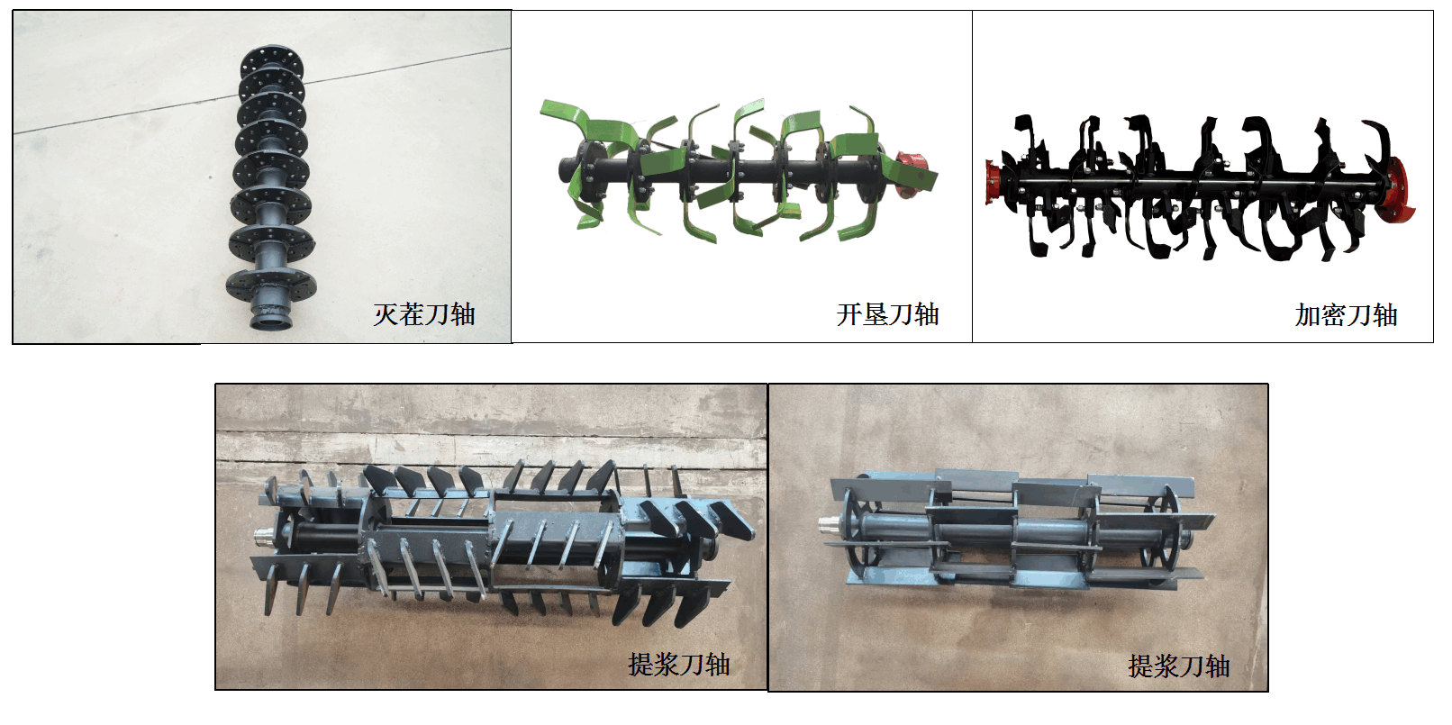 可根据水旱田及农艺需要配制:灭茬刀轴、开垦刀轴、提浆刀轴、加密刀轴。