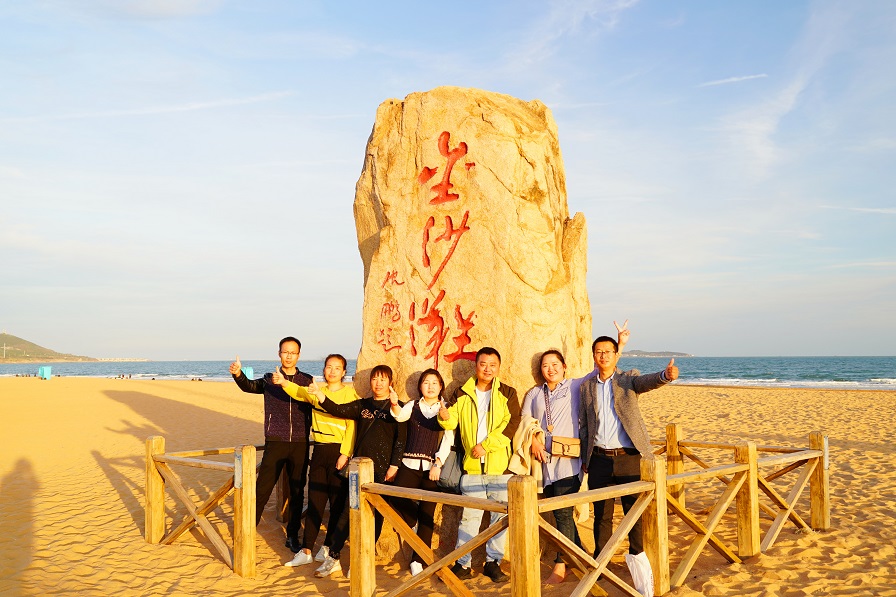 上午的参观学习让每一个人都长了见识,开阔了眼界。下午一行人来到了号称“亚洲第一滩”的黄岛金沙滩。黄岛金沙滩位于黄海之滨,色泽如金,故称“金沙滩”。是我国沙质最细、面积最大、风景最美的沙滩之一。