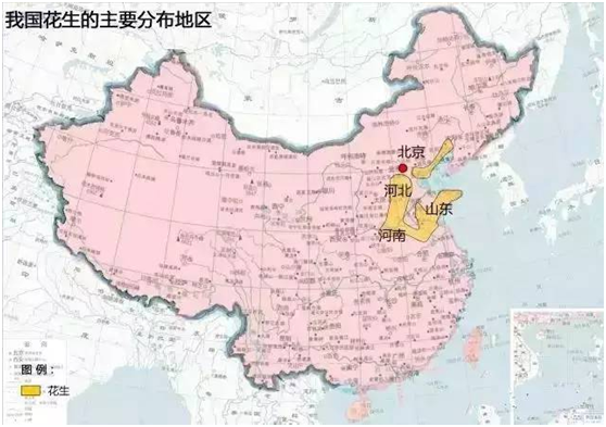 花生主要分布在我国东部的暖温带、亚热带、热带的沙土和丘陵地区