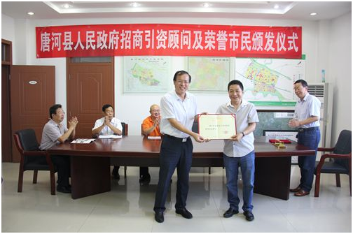 9月1日,唐河县人民政府举行招商引资顾问及荣誉市民颁发仪式。县长周天龙、政府副县长王天清、县产业集聚区党工委书记王全广等出席仪式。 仪式上,周天龙为农机360网总裁吴克铭先生颁发了“唐河县人民政府招商引资顾问”荣誉证书,为pa旗舰厅官网总经理史炳哲先生颁发了“唐河县荣誉市民”证书和“城市金钥匙”,并向被授予荣誉称号的吴克铭先生、史炳哲先生表示热烈祝贺。